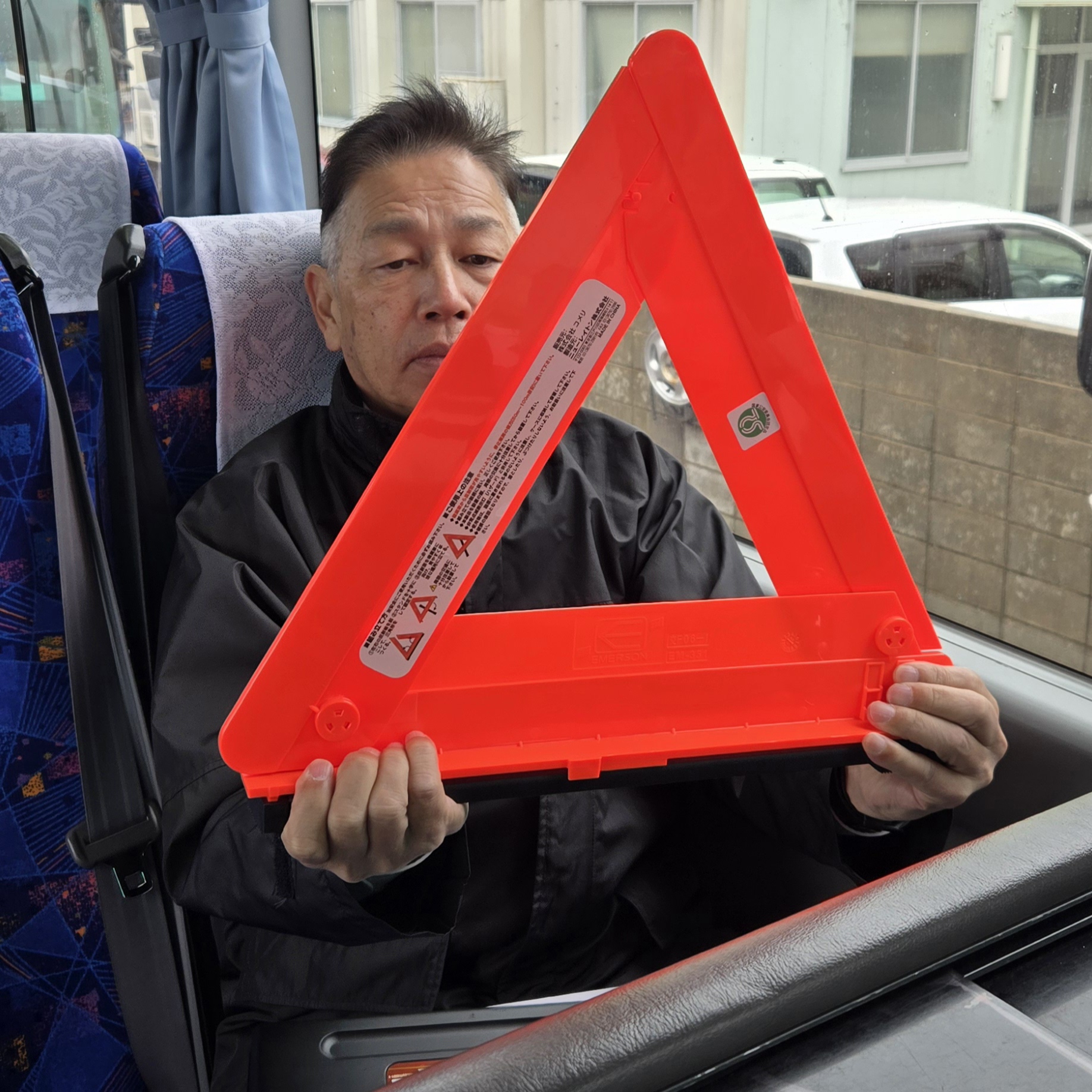 停止表示器材(通称・三角表示板)は三角になっている状態は見たことあるものの、格納されている状態から組み立ては、なかなかサッとできないものですので、1人ずつ回して実際に組み立てを行いました。