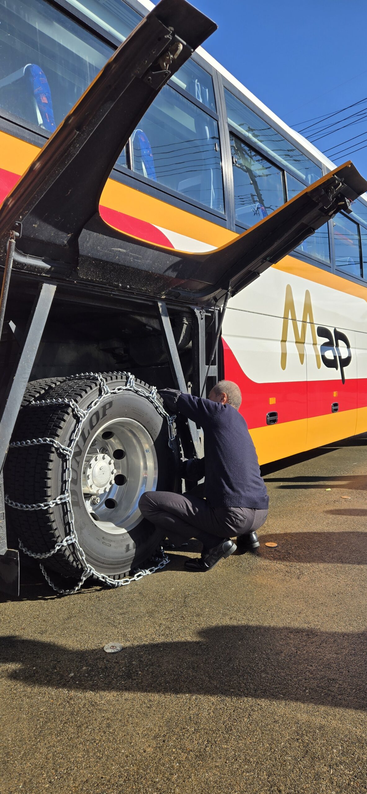 吹きさらしや、融雪装置の無い市街地の圧雪等、チェーンを巻かなければならない運行シーンは山間部に限らず突然やって来ることもあります。
