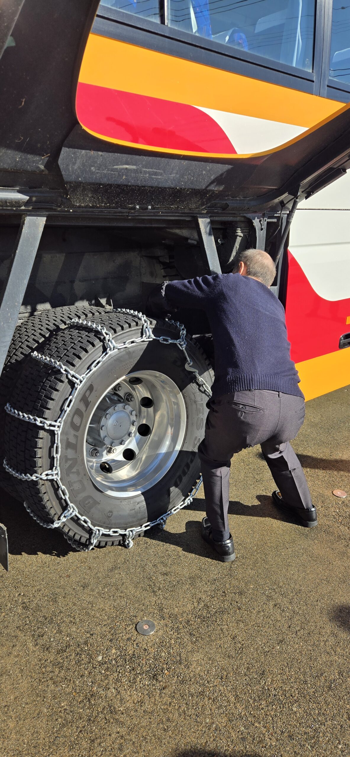 吹きさらしや、融雪装置の無い市街地の圧雪等、チェーンを巻かなければならない運行シーンは山間部に限らず突然やって来ることもあります。