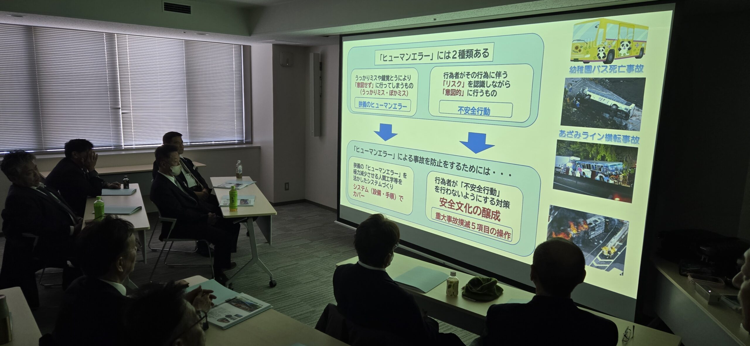 ヒューマンエラー(人間の行動特性としてミスや不注意は誰もが持っている人間本来の特性。このミスや不注意が結果として事故や災害が発生した時の事)、それが要因で起こる事故を防止する為の方法をドラレコ映像等の実例を見ながら学びました。