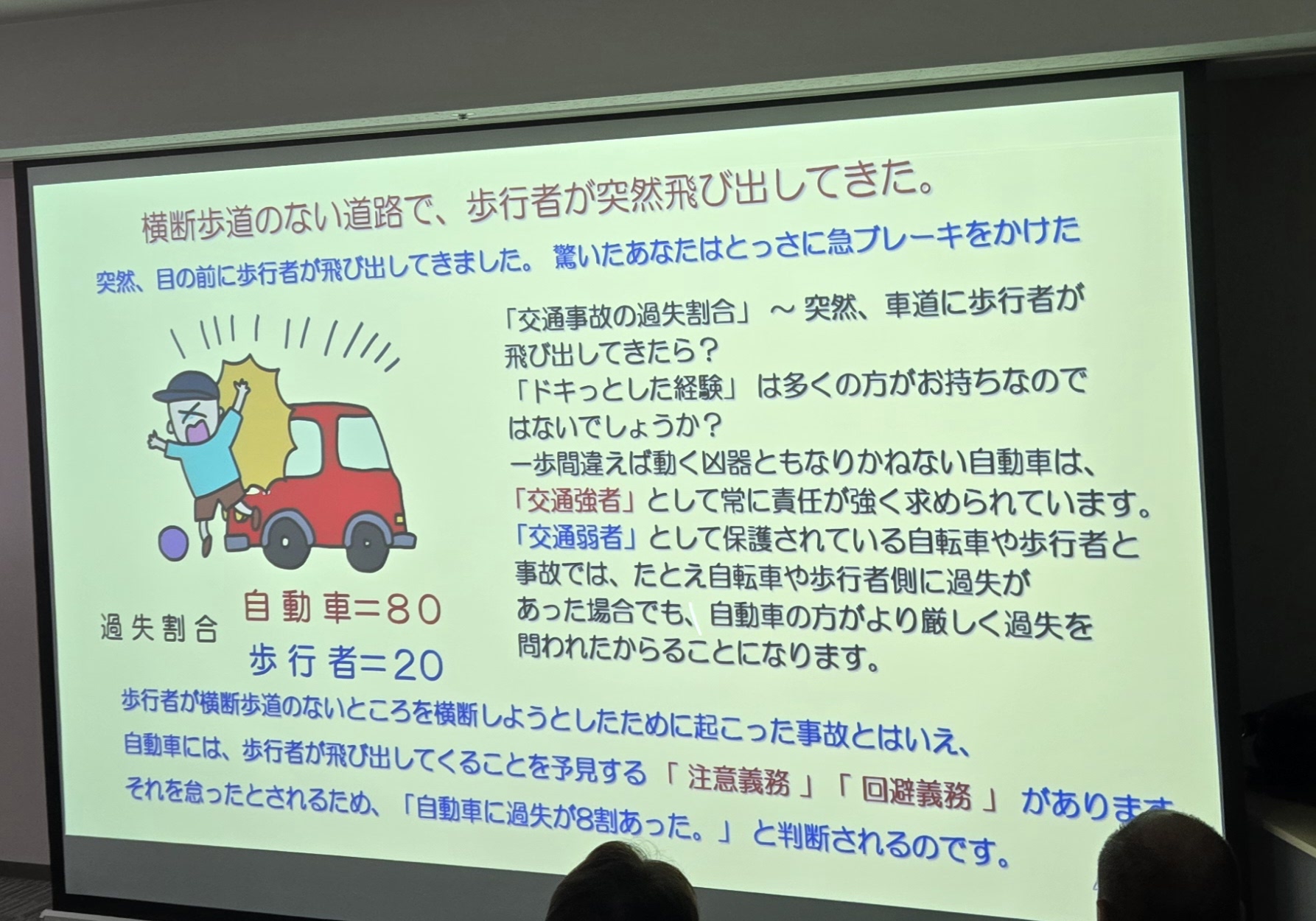交差点での事故、特に右折の事故は左折の4倍にも上るとのことで、右折の歩行者や二輪車を見落としがちになっている現状が数字を通してよくわかりました。